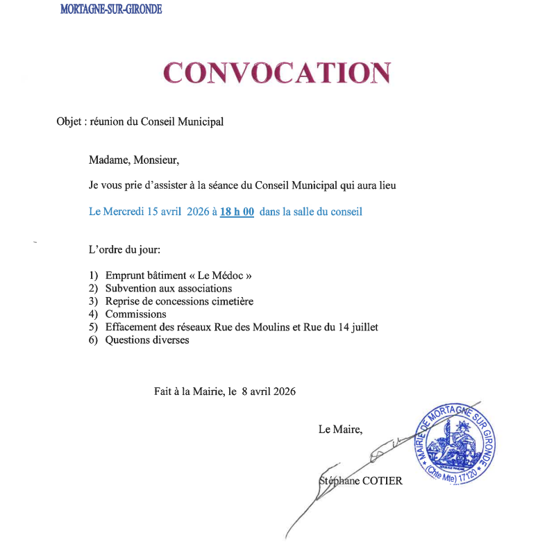 Convocation au Conseil Municipal du 15 avril 2026