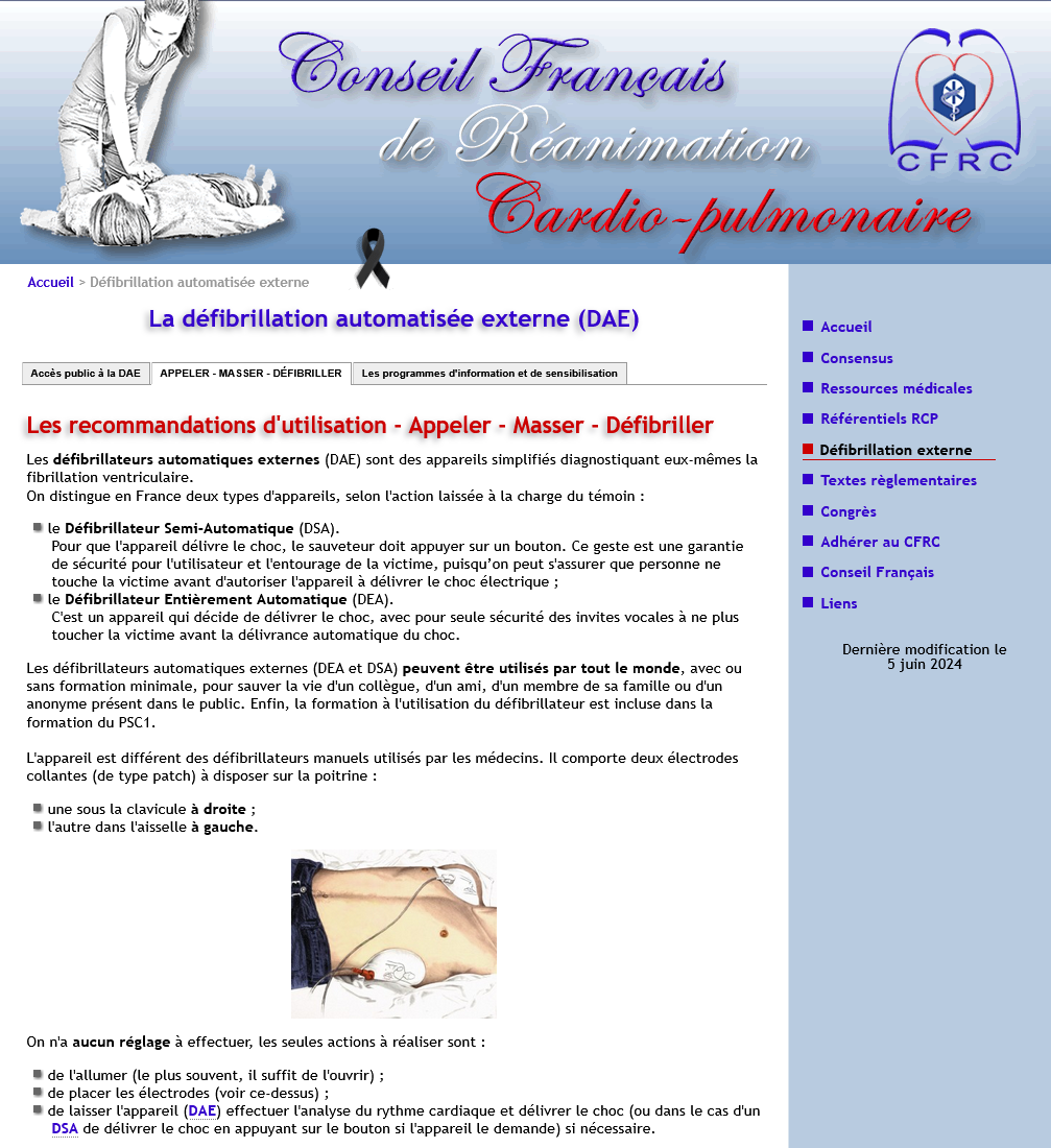 Pour connaître par avance le fonctionnement d’un défibrillateur, le site internet du Conseil Français de Réanimation Cardio-pulmonaire (CFRC) fournit les informations nécessaires sur sa page dédiée aux DAE.