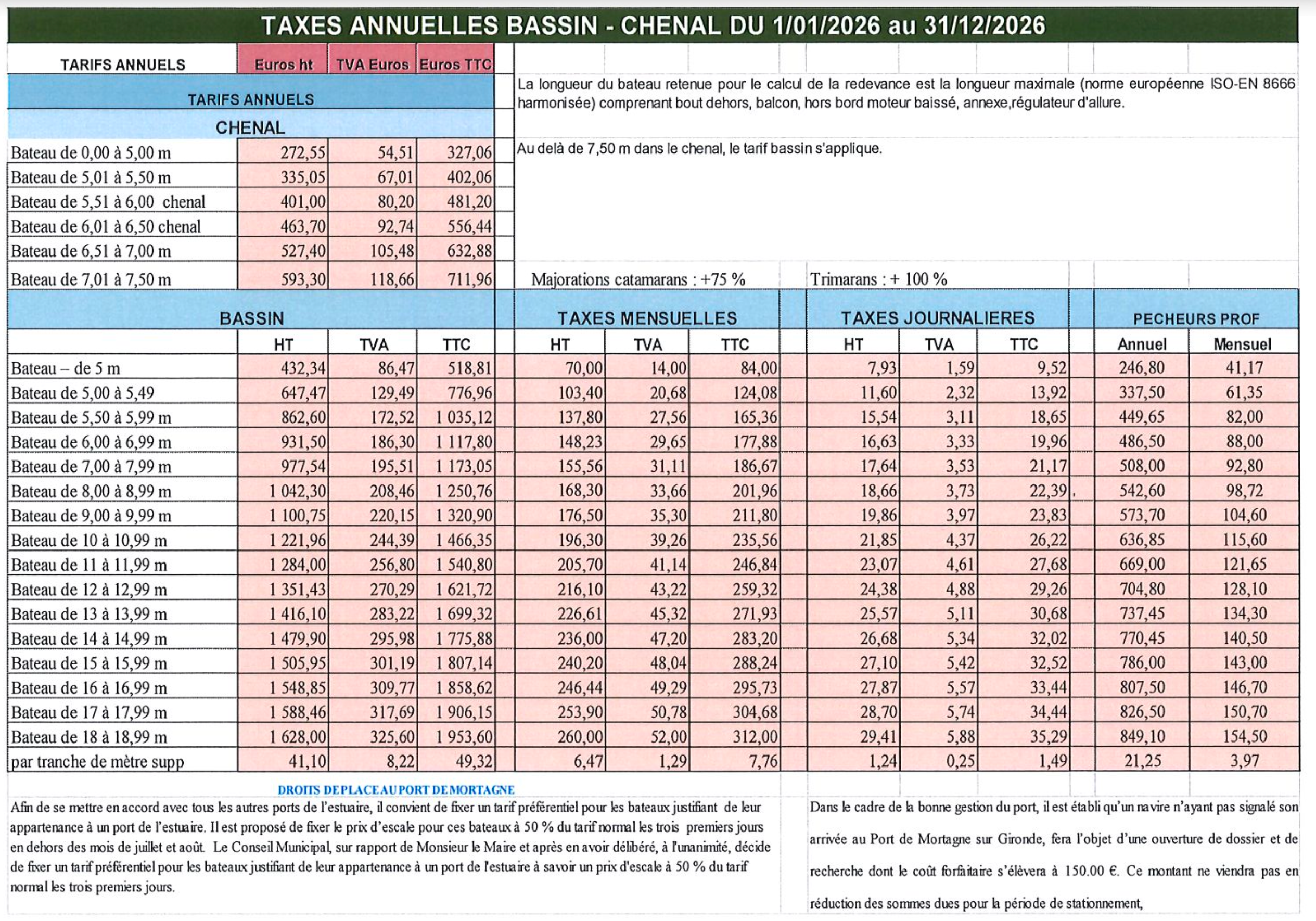 Tarifs du port de Mortagne sur Gironde 2026